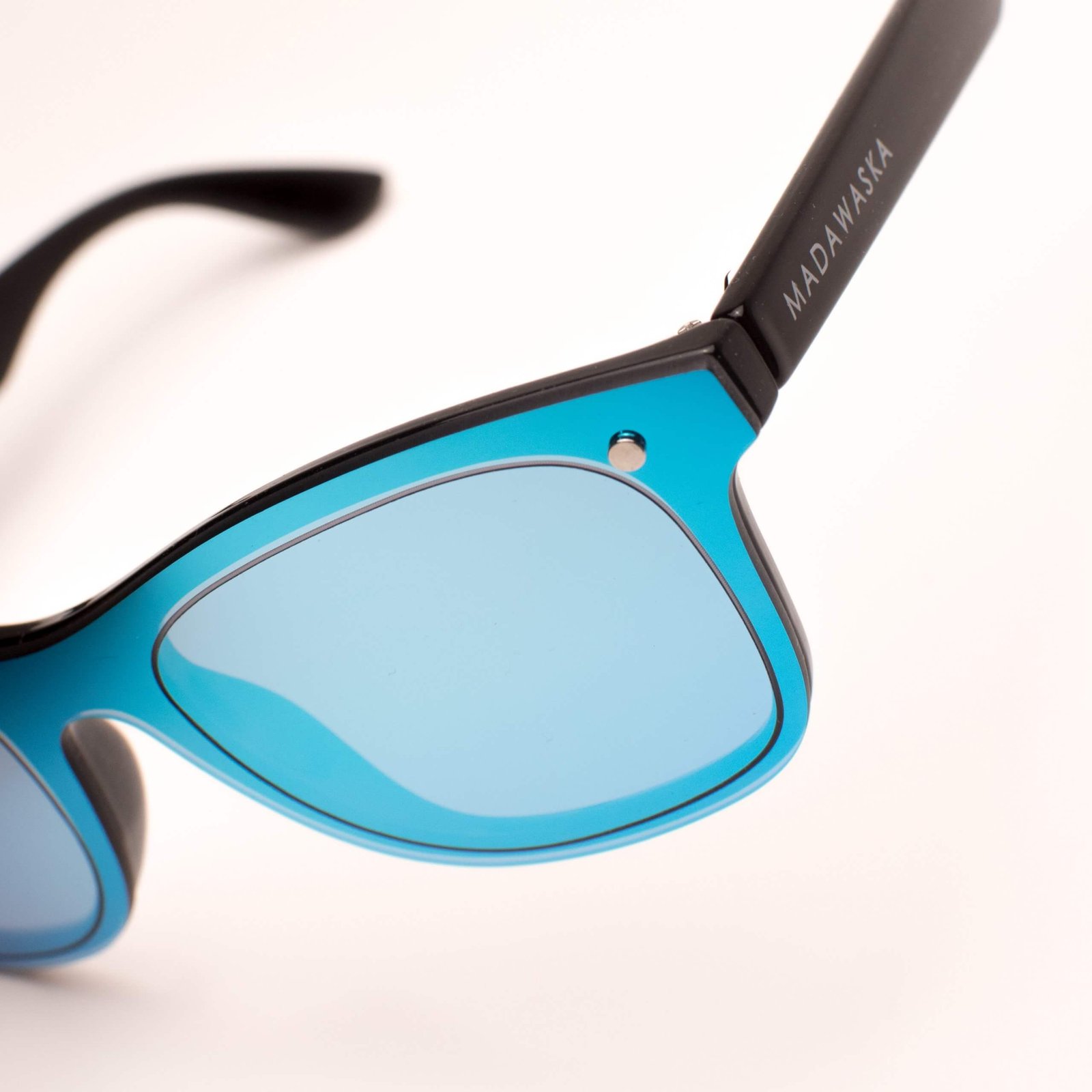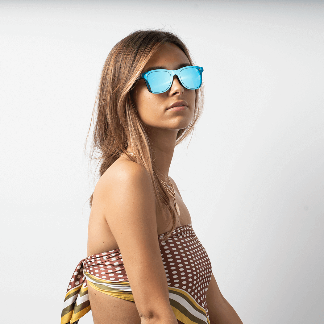Unisex glasses full mirror effect and classic design. Black polycarbonate frame and one-piece iridescent mirror effect lens, in blue and purple, category 3 UV400, more resistant to impacts.