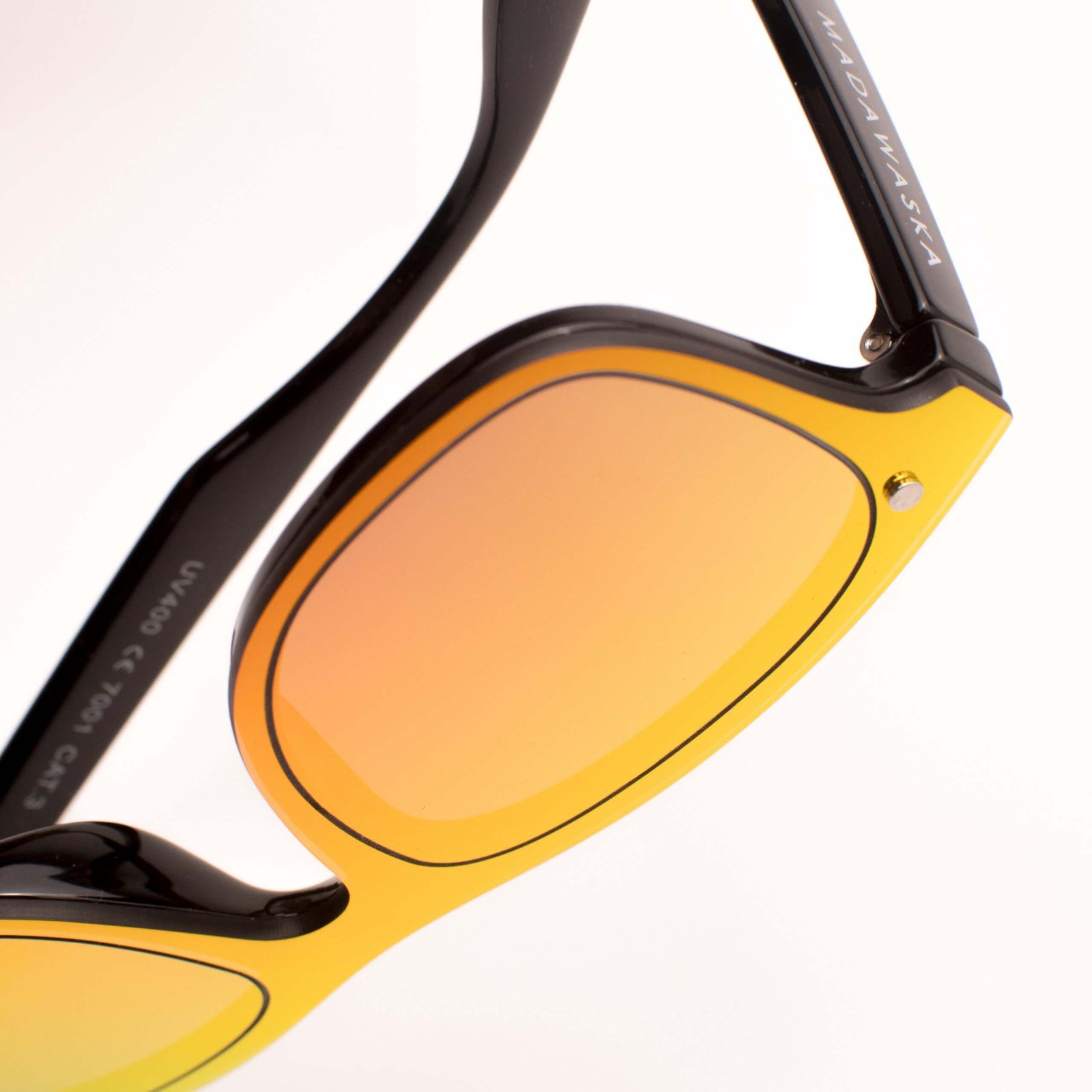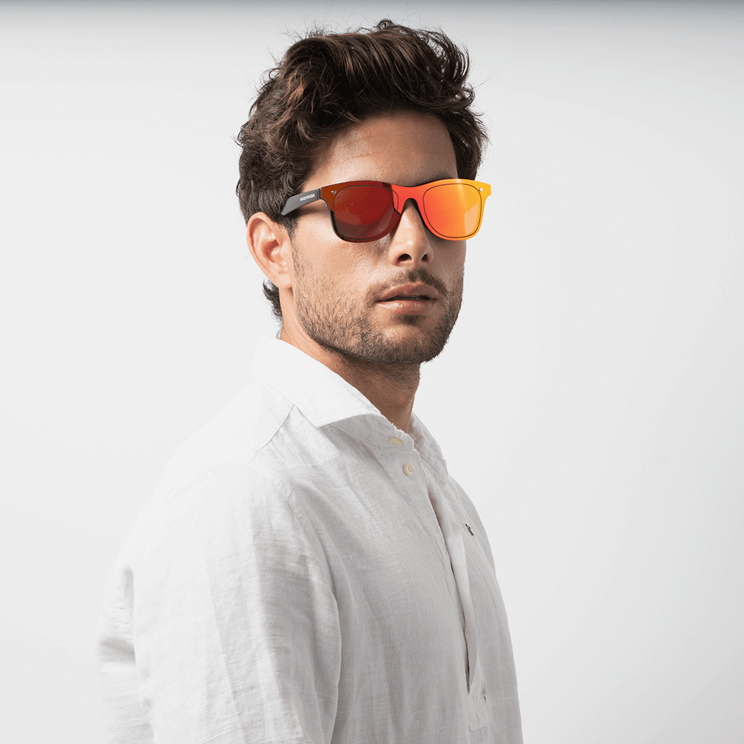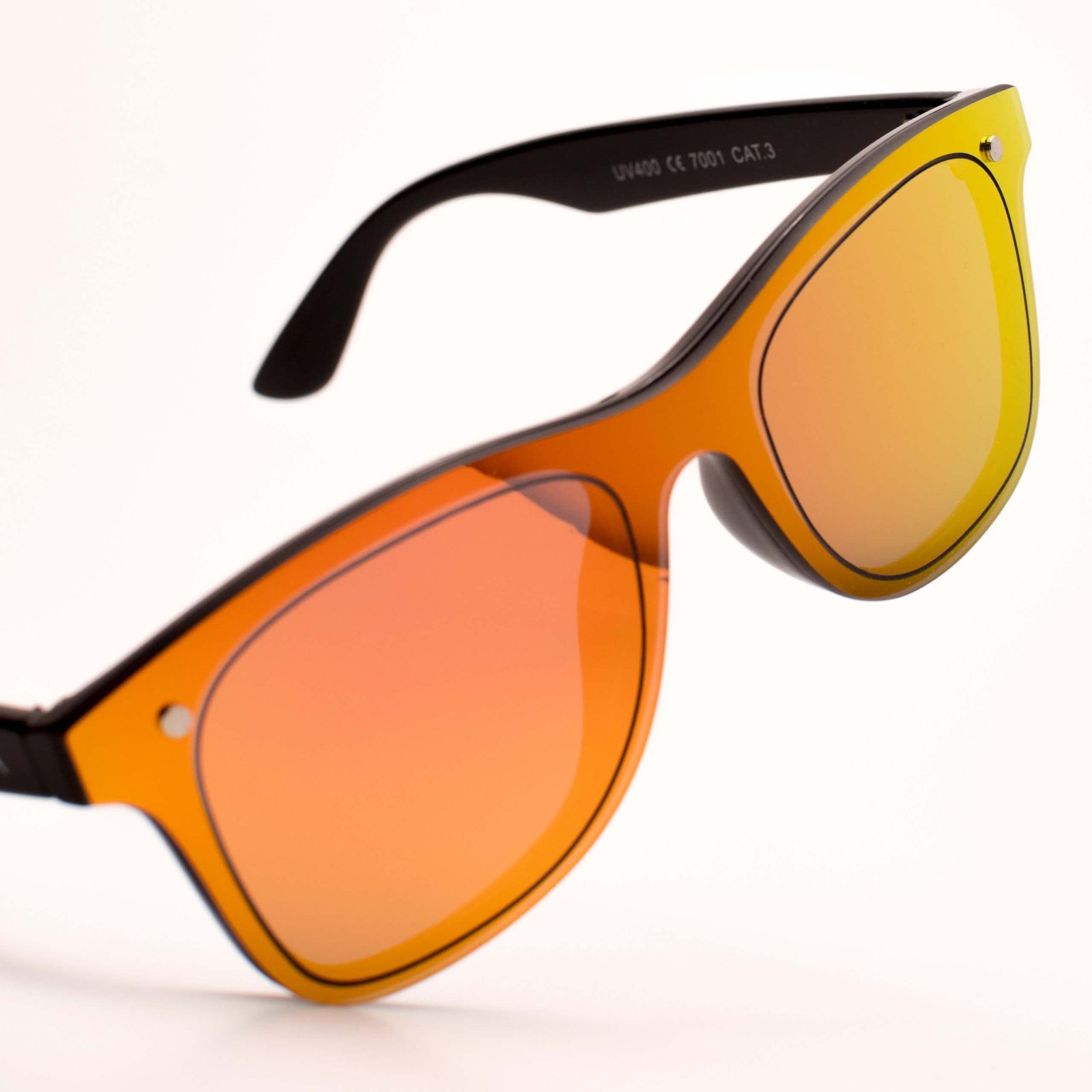 Unisex glasses full mirror effect and classic design. Black polycarbonate frame and one-piece iridescent mirror effect lens, in yellow and orange, category 3 UV400, more resistant to impacts.