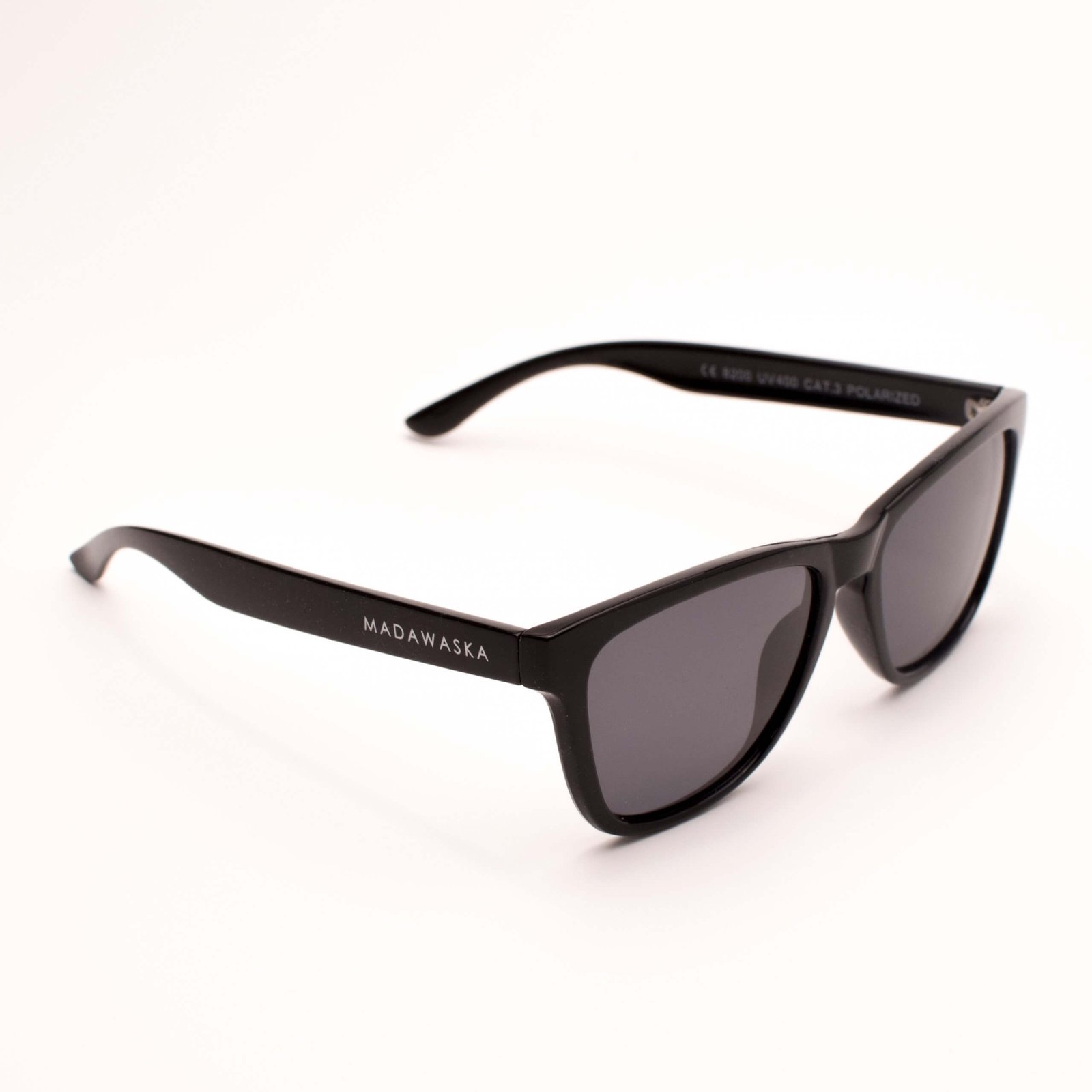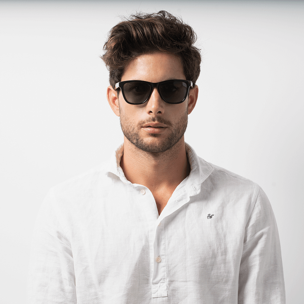 Unisex glasses with classic design. Matte black polycarbonate frame and black polarized lenses, category 3 UV400, more resistant to impacts.