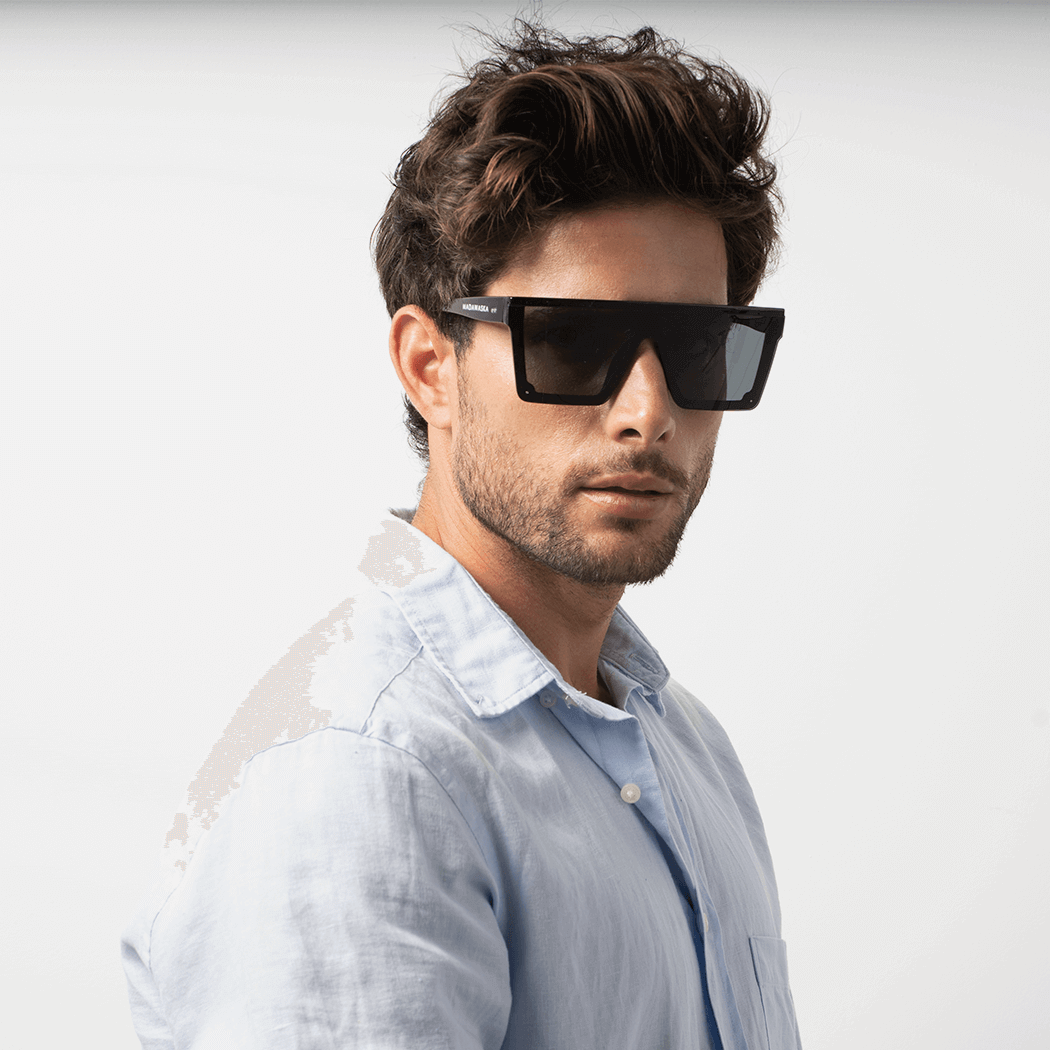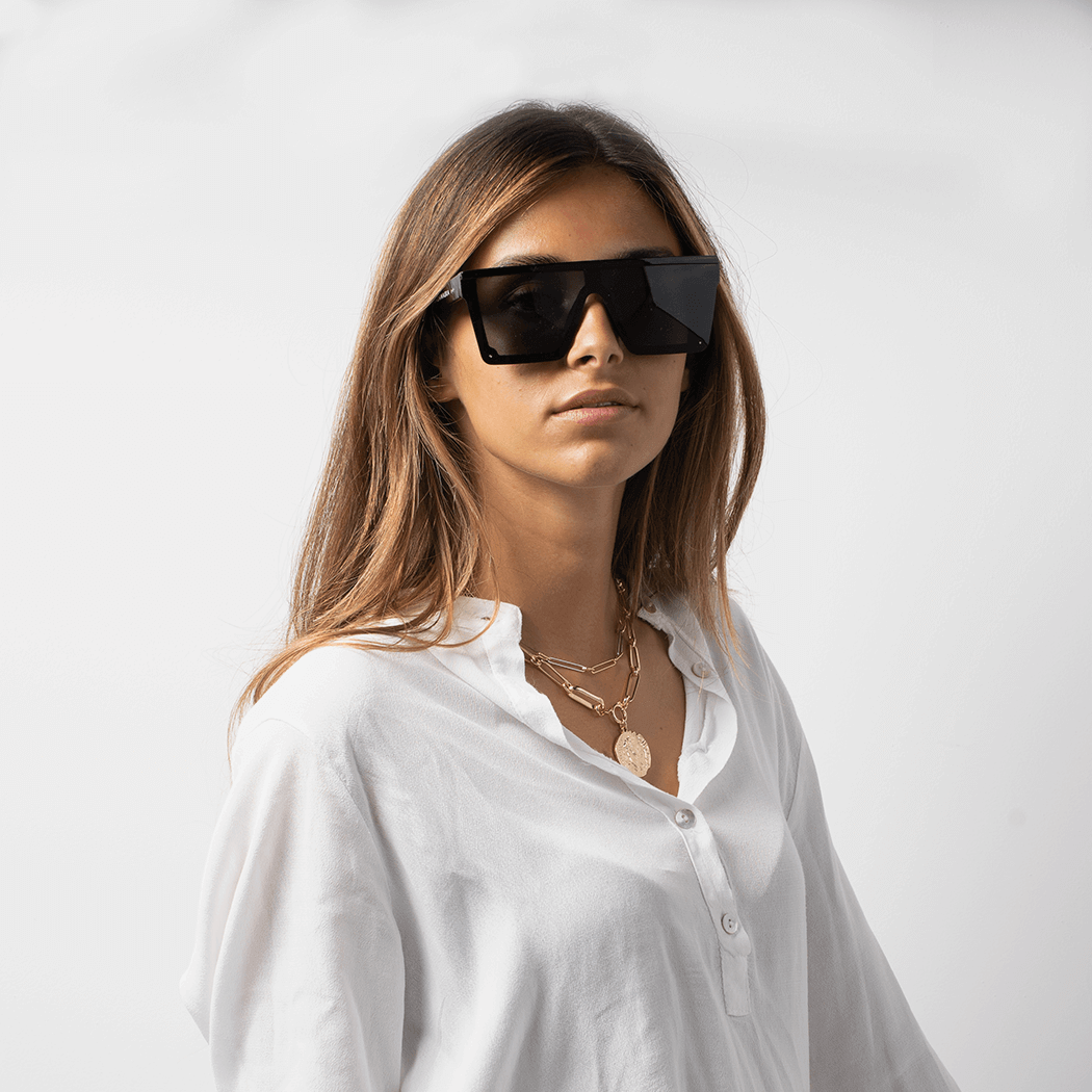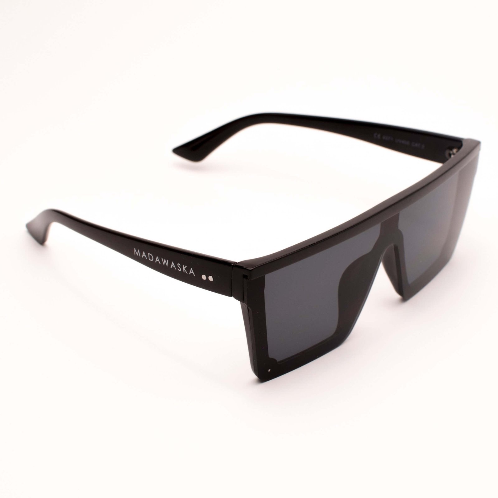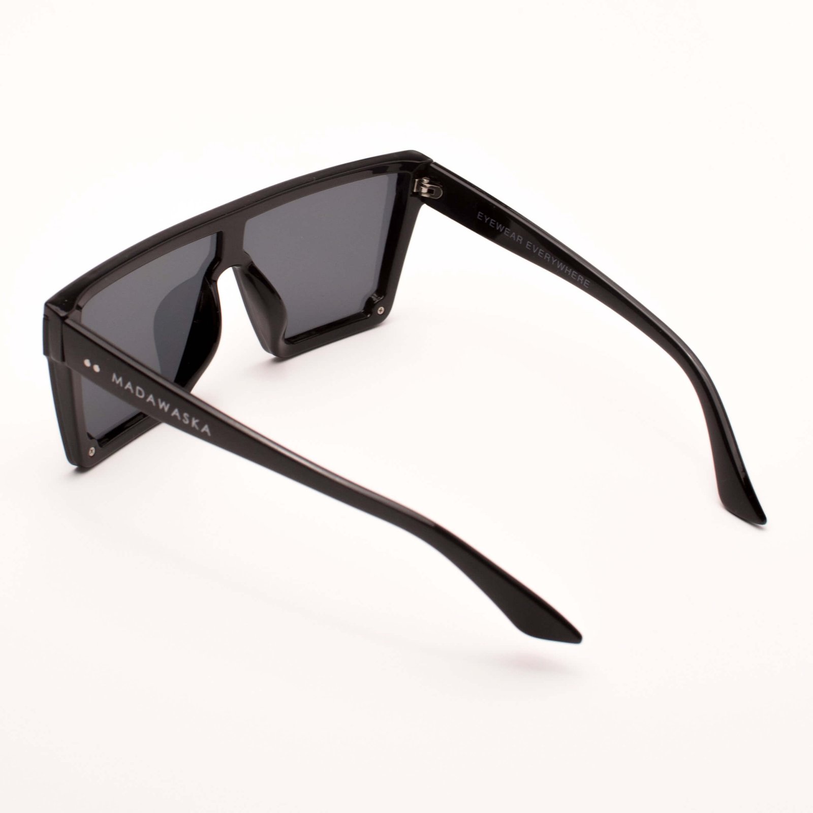 Unisex glasses with oversize design. Black frame made of polycarbonate and black smoked effect lenses. Category 3 UV400 Polarized Impact Resistant Lenses