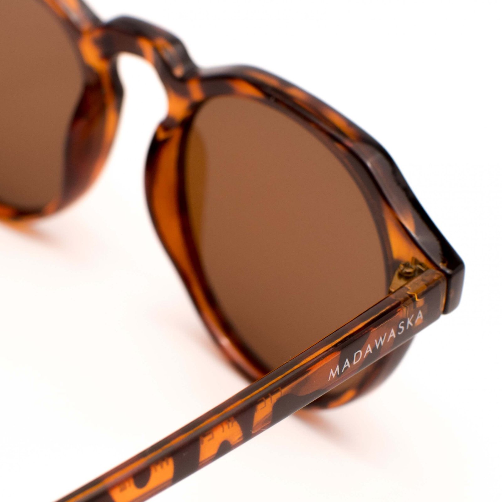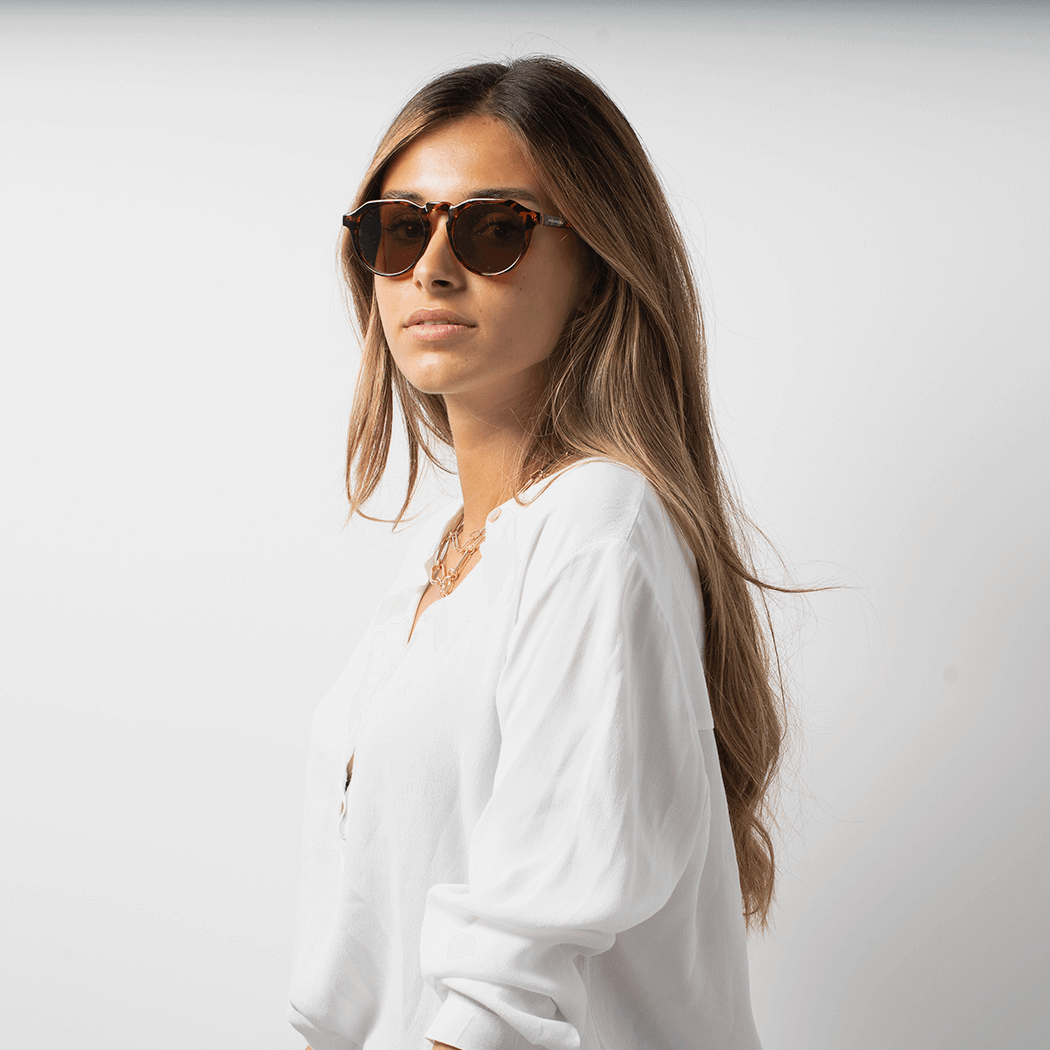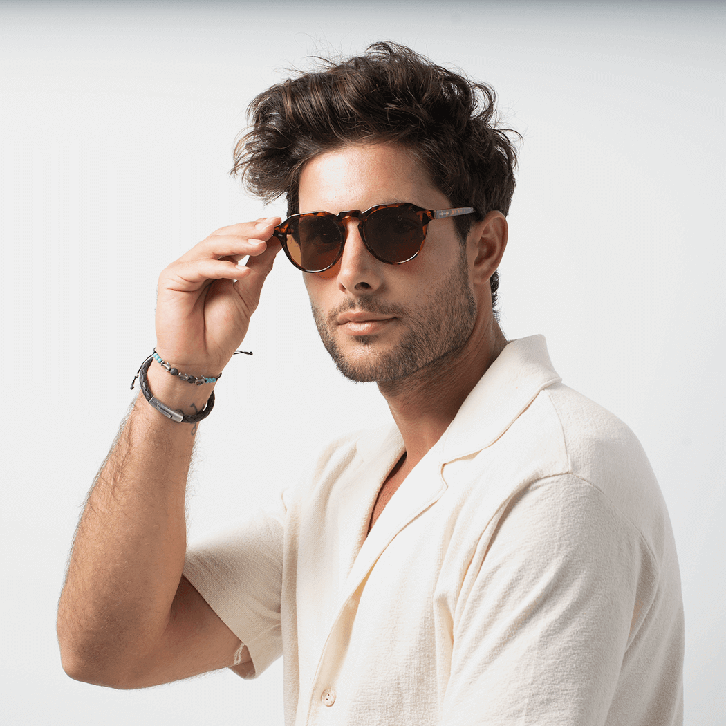 Unisex glasses current design with tortoiseshell effect frames and brown lenses. Made of polycarbonate and category 3 UV400 polarized lenses.