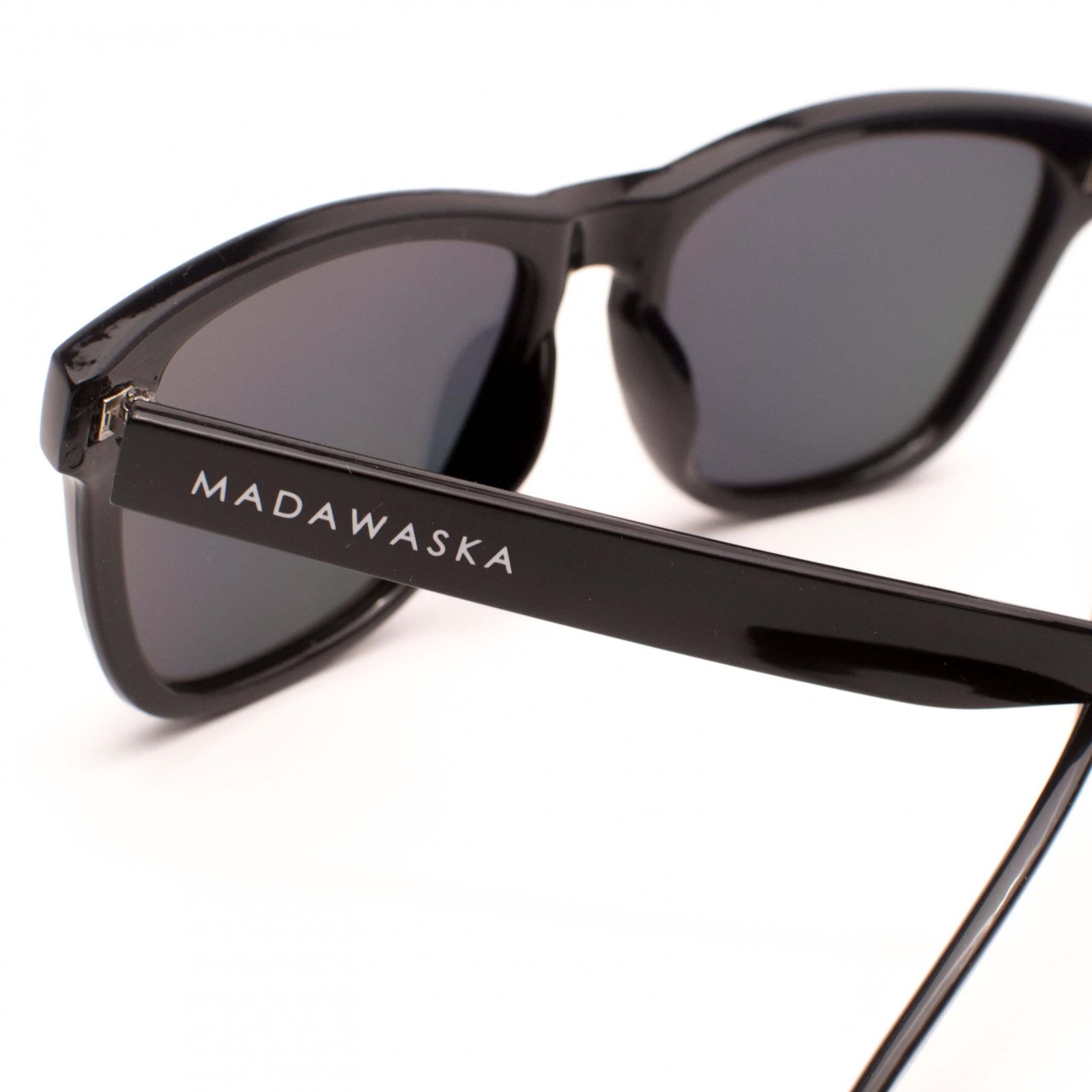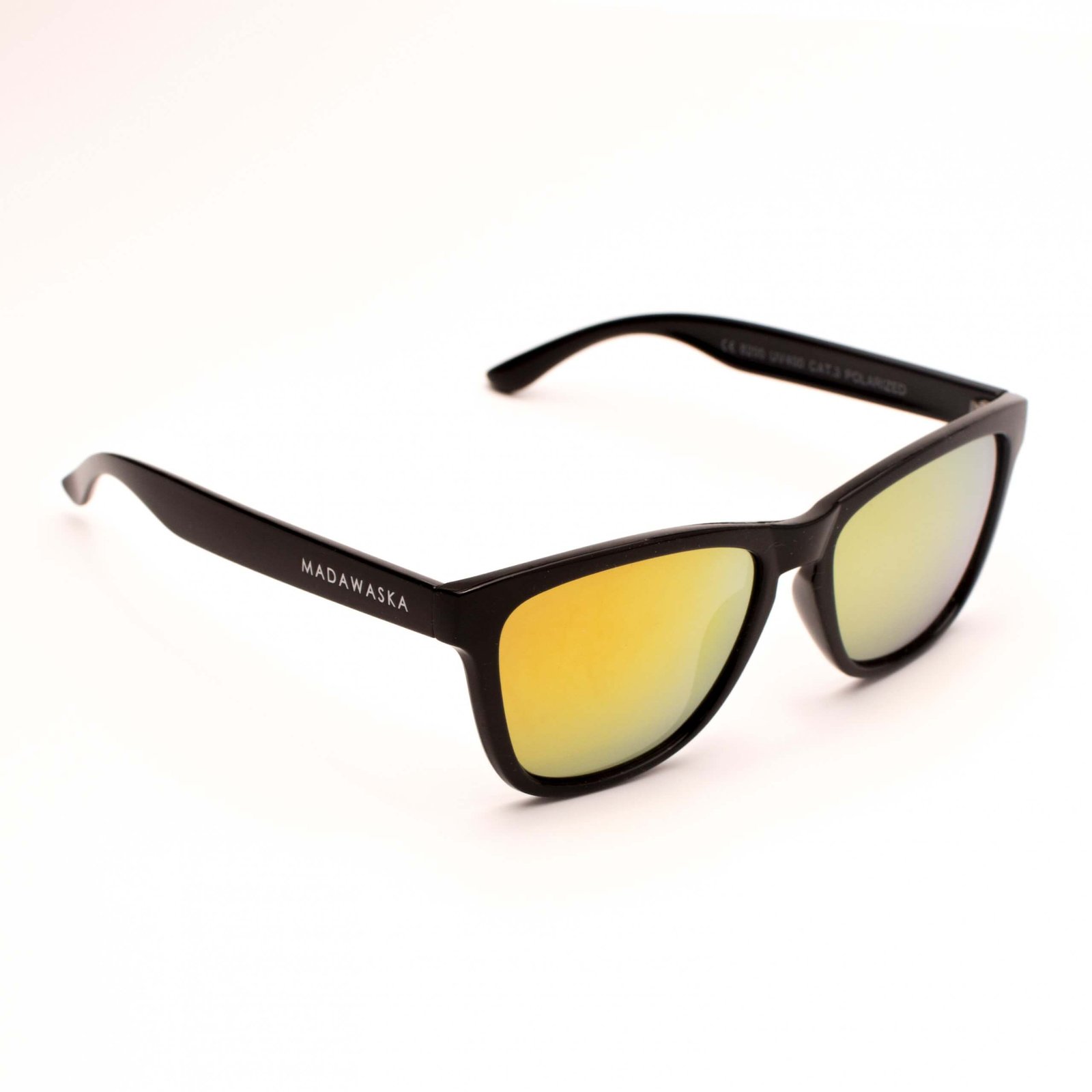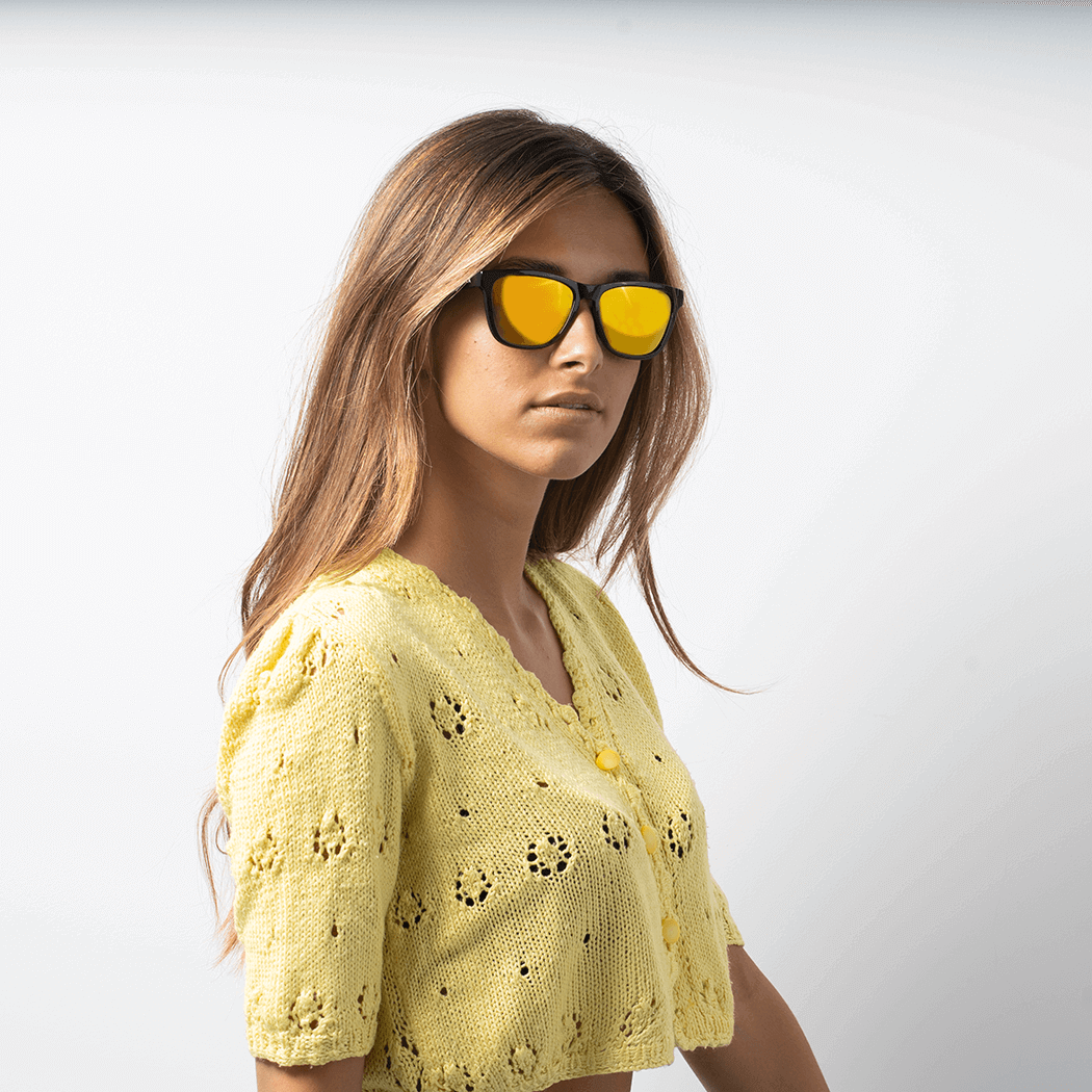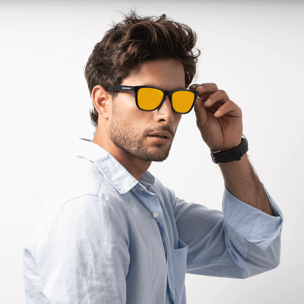 Unisex glasses with classic design and mirror effect lenses. Black polycarbonate frame and yellow and orange iridescent polarized lenses, category 3 UV400, more resistant to impacts.
